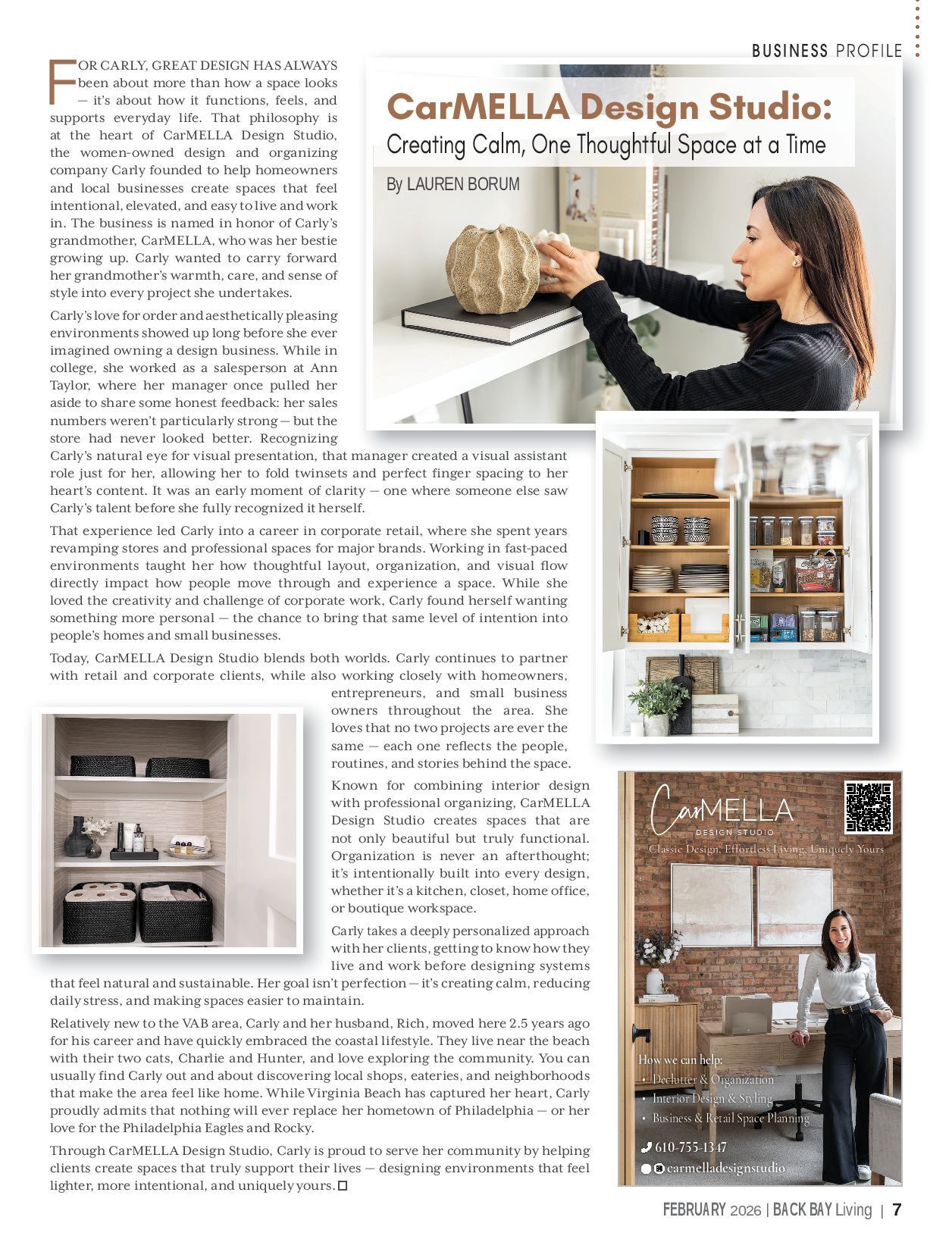 For Carly, great design has always been about more than how a space looks — it’s about how it functions, feels, and supports everyday life. That philosophy is at the heart of CarMELLA Design Studio, the women-owned design and organizing company Carly founded to help homeowners and local businesses create spaces that feel intentional, elevated, and easy to live and work in. The business is named in honor of Carly’s grandmother, CarMELLA, who was her bestie growing up. Carly wanted to carry forward her grandmother’s warmth, care, and sense of style into every project she undertakes.